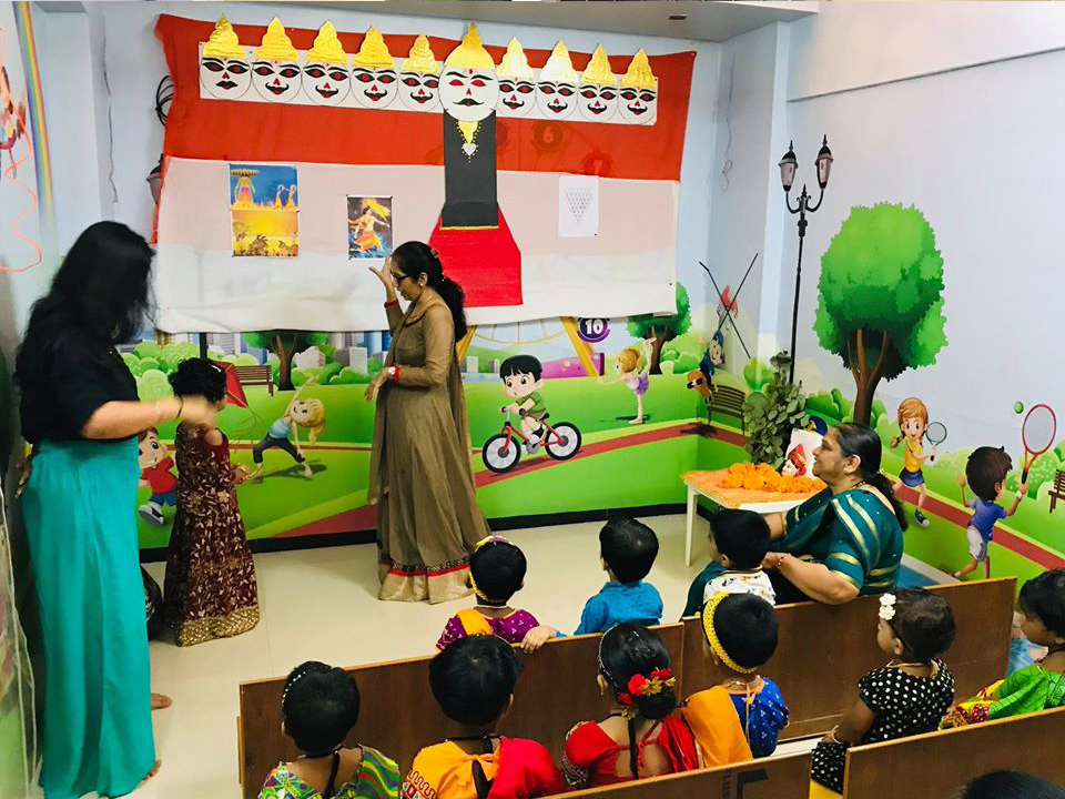 Mythological tales are narrated to the kids with symbolic burning of Ravana depicting the triumph of good over evil.