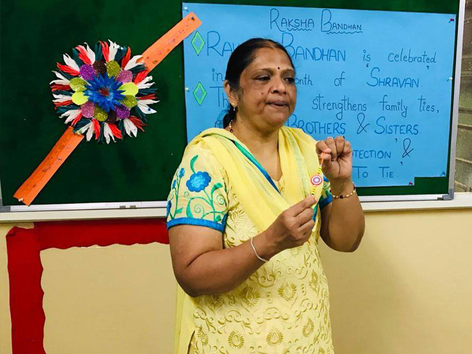 On Raksha Bandhan day, kids are asked to come in traditional attire. All the kids tie rakhi to each other.